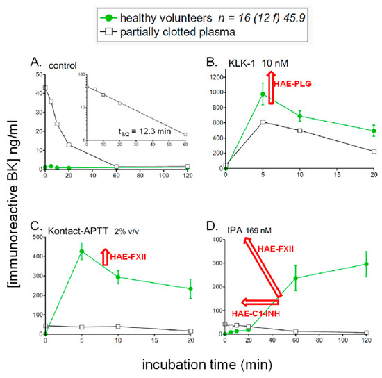 Kinetics of iBK concentrations as a function of time and stimulation in samples of normal plasma incubated at 37 °C in the presence of enalaprilat (130 nM). Panels represent different forms of in vitro stimulation added to plasma at time zero: (A) control; (B) KLK-1 10 nM; (C) Kontact-APTT™ 2% v/v; (D) tPA 169 nM. The data is from the fusion of the 2 control groups (healthy volunteers) from [18,44]. The average age is 45.9 and 12 females are represented in this group of 16 subjects. Indications of significant variations induced by specific HAE subtypes are indicated by red arrows. Measurements made from a partly clotted plasma sample are also shown: in the presence of enalaprilat but no other stimulant, the sizeable concentration of BK at time zero decreases according to a first-order elimination kinetics (panel A, t1/2 12.3 min, inset).