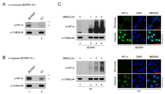 Expression of HIF-1α in thyroid cancer lines. (A) HIF-1α expression levels in different thyroid cancer cells under normoxia. Thyroid cancer cells (BCPAP and K1) were seeded and incubated in normoxic conditions. Cell lysates were immunoblotted with anti-HIF1α and anti-TUBULIN. (B) HIF-1α expression levels in different thyroid cancer cells under hypoxia (with DMOG for 4 h). Thyroid cancer cells (BCPAP and K1) were seeded and incubated in hypoxic conditions. Cell lysates were immunoblotted with anti-HIF1α and anti-TUBULIN. (C) Western blotting and immunofluorescence analysis of HIF-1α expression of BCPAP and K1 cells after DMOG treatment. (Left) Western blot analysis of HIF1α protein in hypoxia condition. BCPAP and K1 cells were seeded and treated with DMOG at indicated time point. Cell lysates were immunoblotted with anti-HIF1α and anti-TUBULIN. (Right) Immunofluorescence analysis of HIF1α protein under normoxia or hypoxia. BCPAP and K1 cells were stained with HIF1α antibody. Nuclei were counterstained with DAPI. Scale bar represents 50 μm (100×).