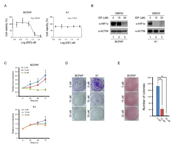 The half maximal inhibitory concentration (IC50) for HIF-1α of IDF-11774 was determined at the dose of 30 μM (Figure 2A). After treatment of IDF-11774, the expression of HIF-1α in BCPAP and K1 cells decreased in a dose-dependent manner (Figure 2B). In cell viability and colony formation assays, the proliferation of BCPAP cells was inhibited by IDF-11774 in a dose-dependent manner (Figure 2C,D). In K1 cells, which did not show definite HIF-1α expression in normoxic conditions, the IC50 could not be calculated. No inhibitory effects on K1 cell proliferation were observed. In anchorage-independent growth, BCPAP cells dramatically decreased their colony number after IDF-11774 treatment in a dose-dependent manner (Figure 2E).