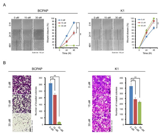In the wound healing assay, wound closure was observed at indicated incubation times with DMSO, IDF 15 μM IDF-11774, or 30 μM IDF-11774. BCPAP and K1 cells were seeded at 5 × 105 cells per well in 6-well plates and incubated. Cell monolayers were wounded with a sterile 200-μL pipette tip and washed with medium to remove detached cells and fresh medium with DMSO, 15 μM IDF-11774, or 30 μM IDF-11774 was added. Cell migration was evaluated by measuring the differences in the areas of the wounds.
