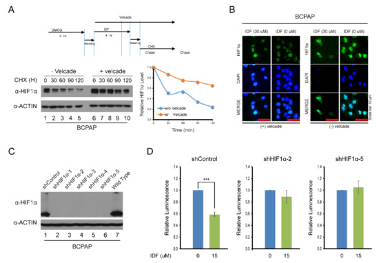 Alteration of the drug effect on HIF-1α expression after knockdown of HIF-1α and treatment with cycloheximide and velcade. (A) Analysis of HIF-1α expression after IDF-11774 treatment with cycloheximide and velcade. BCPAP cells were incubated with DMOG for 4 h. Cells were treated for 4 h with IDF-11774 alone or with IDF-11774 and velcade. The half-life of HIF1α was estimated by treating with cycloheximide at the indicated time. (B) Immunofluorescence of HIF-1α expression with IDF-11774 and velcade. BCPAP cells were treated with DMOG for 4 h and incubated for 24 h in the presence or absence of IDF-11774. Cells were stained with HIF1α antibody. Nuclei were counterstained with DAPI. Velcade treatment was administered for 5 h before immunostaining. Scale bar represents 50 μm (100×). (C) Analysis of HIF-1α expression in HIF-1α knockdown BCPAP cells. BCPAP cells stably expressing Control-shRNA or HIF1α-shRNAs were detected by Western blot analysis. (D) HIF-1α knockdown attenuated the effect of cell viability of BCPAP cells treated with IDF-11774. BCPAP Cells stably expressing shRNA were incubated with DMSO or IDF-11774. Cell viability was measured at the indicated time using the CellTiter-Glo system. Data in the graph are presented as mean ± standard deviation of fold increase normalized by cells at day 0 (n = 5, ** p < 0.001).