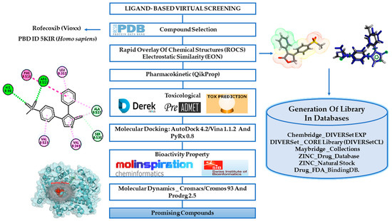In this work, we used a virtual screening ligand-based methodology to identify new potential COX-2 inhibitors based on the rofecoxib structure [12,13,14]. The virtual screening strategy was chosen once it has been widely applied in the early phase of drug discovery, being able to accelerate hit discovery and reducing drug development costs. Thus, the similarity and electrostatic potential of the selected structures were performed using computer programs and commercial databases of compounds [15] and then we performed the filtering of the results considering the pharmacokinetic and toxicological properties [16,17,18,19,20]. Furthermore, the docking simulation evaluated the binding affinity of compounds to COX-2 in comparison with rofecoxib [20,21]. Biological target prediction was used as a screening step through the web server Swiss [22] and the bioactivity was determined on the Molinspiration web server [23]. Finally, we used molecular dynamics to investigate interaction over time in COX-2 of the promising compounds. General scheme of the methodological steps in this article is presented in Figure 2 (see more details in the Materials and Methods section).