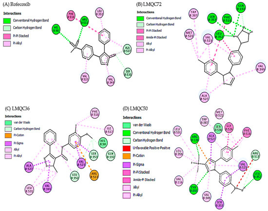 Molecular docking studies (AutoDock/Vina) [62] also allowed us to determine the types of interactions between the target receptor’s binding site with the promising compounds LMQC72, LMQC36 and LMQC50. Table 3 shows the interactions between the hCOX-2 inhibitor rofecoxib (PDB ID 5KIR). In comparison with the pivot, Table 4 shows the types of interactions and amino acid residues between hCOX-2 and LMQC72, LMQC36, and LMQC50.