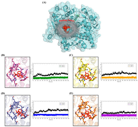 Shows the root mean square deviation (RMSD) plot along the path of molecular dynamics (MD) simulations. RMSD graphs for 150 ns of MD simulations. In all the Figures, the RMSD plot of the hCOX-2 backbone was represented by the color black, while the RMSD of the ligands was represented in different colors. (A) General view of the protein structure with emphasis on the binding pocket occupied by the ligands. The protein was represented in cyan color and ligand protein was represented in spheres (red color). (B) RMSDs of hCOX-2-rofecoxib- system, (C) RMSDs of hCOX-2-LMQC72 system, (D) RMSDs of hCOX-2- LMQC36 system, (E) RMSDs of hCOX-2- LMQC50 system. Ligands and residues were represented in sticks.