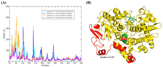 Shows the profile of the root-mean-square fluctuation (RMSF) plot for the hCOX-2 protein backbone that was extracted from the molecular dynamics trajectories. RMSF plot overlay for all complexes. (A) Profile of the RMSF graphs and (B) Representation of the protein, where the residues (37–107) that showed the greatest fluctuations were highlighted in red color.