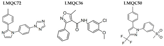 LMQC36 shows an isoxazole ring such as valdecoxib (Figure 1 and Figure 8), linked to the aryl ring by an amide group, which also confers rigidity to the structure and favors an additional Pi-sigma interaction with hCOX (Figure 5C). Compound LMQC72 present an imidazole ring, favoring a Pi-Pi stacking interaction with hCOX-2 (Figure 5D) [85].