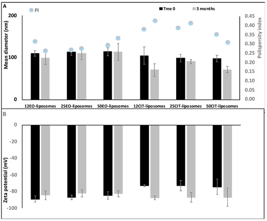 | 25CIT-liposomes | 99 ± 9 § | 0.387 ± 0.032 | −70 ± 8 | 91 ± 11 |