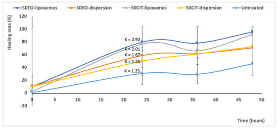 | 50CIT-liposomes | 97 ± 7 § | 0.351 ± 0.083 | −74 ± 9 | 89 ± 10 |