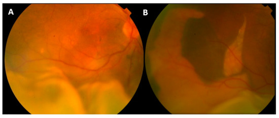 Fundus photographs reveal an exudative inferior retinal detachment macula-off (A) with a large retinal pigment epithelial tear in the temporal quadrant (B). Reproduced with permission from [14].
