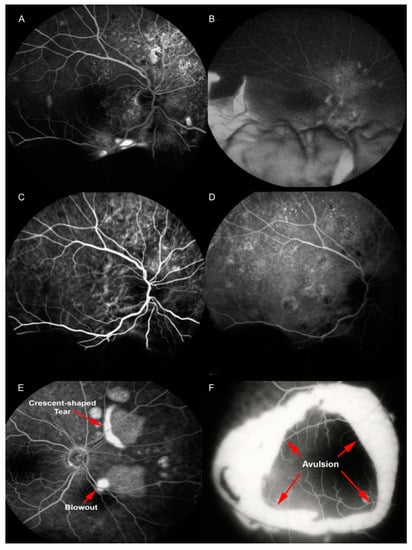 Fluorescein angiography (FA) reveals multiple areas of leakage at the posterior pole in the early phase (A); with consequent pooling of the subretinal space and the dependent exudative retinal detachment (B). Indocyanine green angiography (ICGA) shows hyperpermeable and dilated choroidal vessels (C); in late phase pigment epithelial detachment (PED) it appears still hypofluorescent (D). FA shows focal area of hyperfluorescence (blowouts) within PED and an RPE tear with crescent shape (E). FA delineates a concentric RPE tear, with a retracted RPE at the center (F). Reproduced and merged with permission from [6,14].