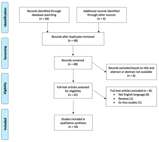 From the total of 60 studies identified following the initial literature search, 48 abstracts were identified for screening after the elimination of duplicated records. Forty-two of these met the inclusion/exclusion criteria for full-text review. Eight articles were excluded: six not written in English, 1 review papers and 1 ex vivo studies. After full-text evaluation, 34 studies about bCSCR were included [2,3,4,5,6,7,8,9,10,11,12,13,14,15,17,18,21,22,23,24,25,26,27,28,30,31,32,33,35,36,37,38,39,40].