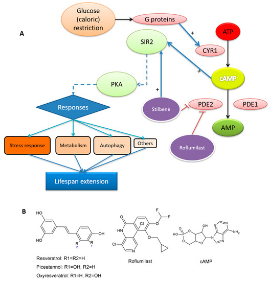 (A) Simplified scheme of yeast lifespan extension; (B) structure of resveratrol (RSV), oxyresveratrol (OXY), piceatannol (PIC), roflumilast and cAMP.