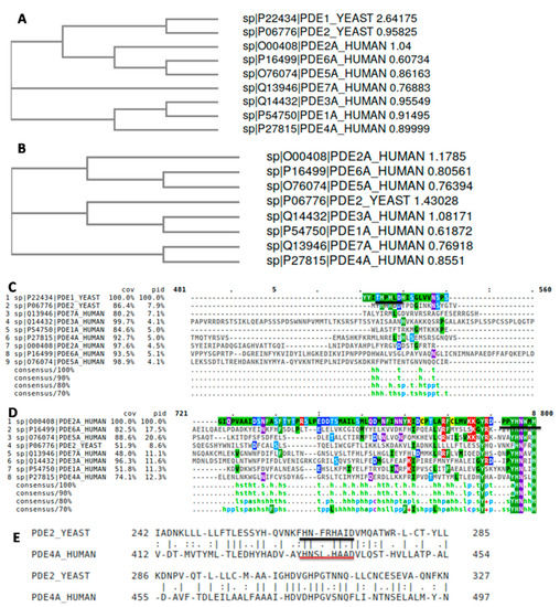 NJ phylogenic tree of all (A) human and yeast PDEs and (B) without yPDE1; (C) detail of MUSCLE multiple alignment for all PDEs; indicated, the yPDE1 active site; (D) detail of MUSCLE multiple alignment for all PDEs without yPDE1; indicated, the yPDE2 active site; (E) pairwise alignment between yeast yPDE2 and human PDE4A; indicated the active sites.