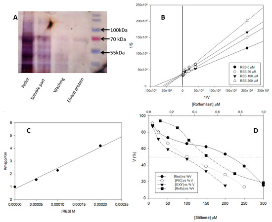 (A) SDS-Page silver staining of yPDE2 purification (enzyme MW ≈63 KDa); (B) Lineweaver–Burk plot of the effect of different RSV concentrations on yPDE2 activity (sample buffer at 25 °C); (C) competitive Michaelis–Menten plot (Equation (3)); (D) effect of different inhibitors against yPDE2 activity (sample buffer at 25 °C) using 0.08 μM of enzyme in all cases.