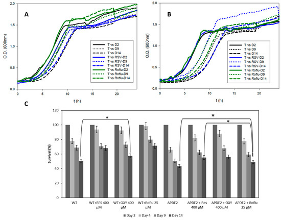 Optical density of maintained cultures at different times (Day 2, 9 and 14) for (A) WT and (B) ΔPDE2 with or without 400-µM RSV or 25-µM roflumilast; (C) Comparative analysis of the survival in all treated cultures. (* means p < 0.05 in most relevant results, errors bars represent SD).