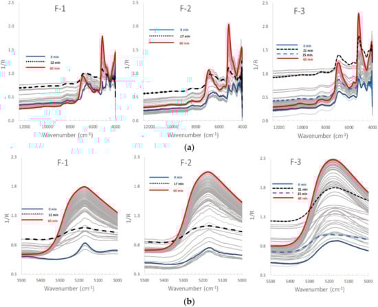 In the granulation of F-2, as the standard formulation mixture (Figure 3a, middle), the spectral baseline increased gradually with increasing Wa, and reached its peak at around 17 min after 150 mL of water was added. After the highest point, the baseline declined with additional Wa, but the increasing intensity of the peaks associated with water at 5250 and 6800 cm−1 was observed.
