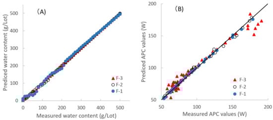 Relationships between measured values and predicted values of the amount of water added and the agitation power consumption during high-speed shear wet granulation processes. (A) The amount of water added (Wa); (B) the agitation power consumption (APC).