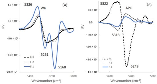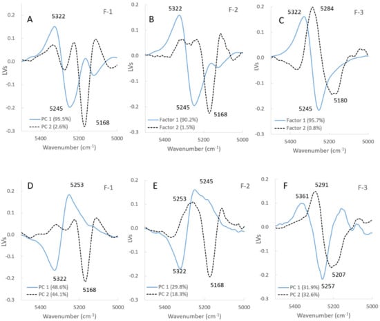 First, the mechanisms to measure Wa in standard powder formulations consisting of lactose and starch were considered based on the individual RVs obtained using NIRS. The RV of the calibration model for Wa of the F-1 formulation, which involved a CPV of 98.2%, had negative peaks at 5168 and 5261 cm−1 and a positive peak at 5326 cm−1. Therefore, in the second derivative spectra (Figure 7A), the peak at 5168 cm−1 related to crystal water of LA monohydrate decreased by dissolution, but the peak at 5261 cm−1 increased due to the formation of aggregates by adding water. In contrast, in the RV of the F-3 formulation, which involved a CPV of 96.5%, a negative peak at 5249 cm−1 related to free water and a positive peak at 5300 cm−1 were observed. The negative peak at 5249 cm−1 increased with increasing amounts of added water, and the peak at 5261 cm−1 increased due to the formation of aggregates by adding water, as shown in Figure 7C. The RV peak pattern of the F-2 formulation (mixture), which involved a CPV of 91.7%, was intermediate between those of the F-1 and F-3 formulations because F-2 contained both LA and PS. The peaks of the RVs of F-1, F-2, and F-3 reflected the peak changes of the individual second derivative NIRS due to increasing amounts of added water in Figure 7A–C, respectively.
