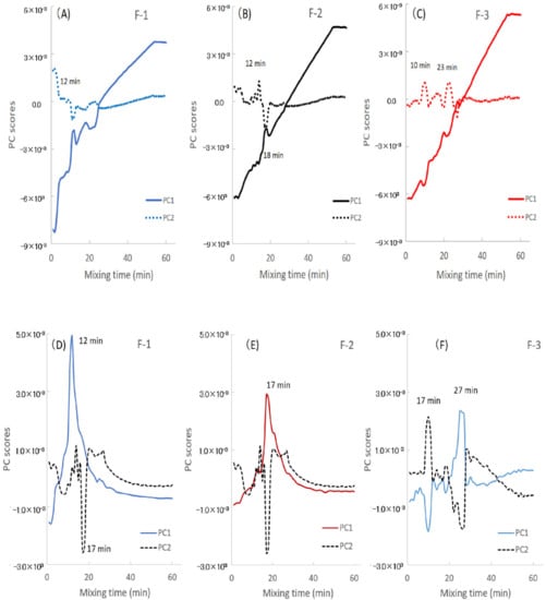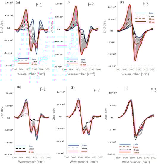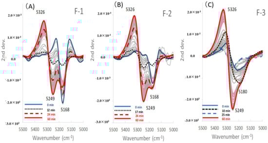 In contrast, in the F-3 formulation (PS), the LV1 and LV2 in Figure 5C showed negative peaks at 5245 and 5180 cm−1, in which the PVs were 95.7% and 0.8%, respectively. The peak at 5245 cm−1 was attributable to free water, and a broad peak was observed at 5180 cm−1 attributable to water that interacted with PS, as with the intermediate peak between crystalline and free water [31]. In Figure 6C, the score of LV1 (Free water) for F-3 increased constantly with increasing mixing time of 2–52 min. In contrast, the score of LV2 (Absorbed water) had some peaks at 8–27 min but did not increase significantly. The result reflected on the second derivative spectra of the F-3 (Figure 7C), the negative peak at 5180 cm−1 increased with increasing 2–10 min mixing time then it decreased, and shifted to 5249 cm−1 at 10–25 min, then it increased again after 23 min. In the initial stage of mixing time at 2–10 min, the PS absorbed water and swollen, so the peak at 5180 cm−1 increased.