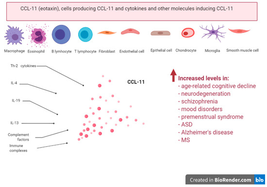 Take-home message; producers and inducers of CCL-11; increased levels in age-related cognitive decline, neurodegeneration, schizophrenia, mood disorders, premenstrual syndrome, ASD, Alzheimer’s disease and multiple sclerosis (MS).