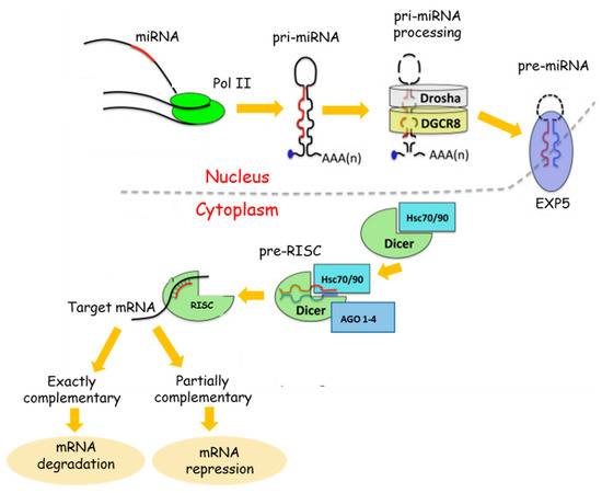 miRNA Biogenesis. The long primary miRNA (pri-miRNA) with its hairpin structure is processed by the Drosha-DCGR8 complex. The microprocessor complex, formed by Drosha and its cofactor DCGR8, leads to the maturation of the pri-miR into precursor miRNA (pre-miRNA). After Drosha processing, pre-miRNAs are exported into the cytoplasm by Exportin 5 (EXP). In the cytoplasm, another RNase guides the maturation of pre-miRNA into the duplex form, i.e., Dicer. Dicer interacts with the double-strand hairpin structure of the cytosolic pre-miRNA and, in collaboration with RNA-binding protein, cleaves the RNA duplex. Further, the mature miRNA, the red strand, is loaded directly into the RNA-induced silencing complex (RISC), whereas the passenger miRNA, the blue strand, is usually degraded. The RISC complex needs the help of two heat shock cognate proteins (HSC70 and 90) that mediate the opening of the argonaute (AGO) protein to receive the miRNA duplex. The RISC receives the duplex, unwinds it, and degrades the passenger miRNA. The pairing between the RISC-mature miRNA and the seed sequence on the target mRNA determines mRNA degradation or mRNA repression. Adapted from Cava et al. [28].