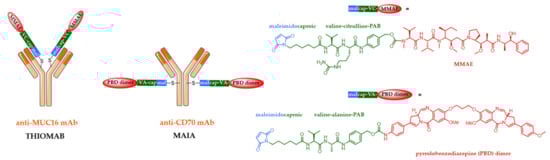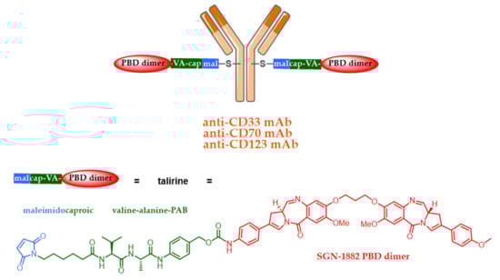 To this end, PBD dimers have been developed. The molecular structure of these dimers contains two alkylating imine functionalities, capable of forming covalent bonds with DNA. Due to the nature of the DNA adducts and their greater stability, PBD dimers generally have significantly higher antitumor cytotoxicity than PBD monomers. They are approximately 50–100 times more effective than the conventional cytotoxics used in ADC (MMAE or DM1), exhibiting picomolar activity against many human tumor cell lines (IC50 = 2–7 pM) [86]. PBD dimers were introduced as ADC cytotoxics by Spirogen and Seattle Genetics in the late 2000s. This led to the development of SGN-CD33A (vadastuximab talirine) [53] and SGN-CD70A [54], two ADCs based on PBDs which unfortunately were recently stopped in phase III clinical trials. SGN-CD33A was associated with a higher rate of patient death due to fatal infection and possible liver toxicity, while SGN-CD70A was responsible of thrombocytopenia. Both ADCs contain the same cleavable linker drug called talirine; a maleimidocaproyl linker with a valine-alanine-PAB trigger sensitive to cathepsin B, capable of conjugating the PBD dimer SGN-1882 on two cysteine residues incorporated by antibody engineering in the hinge region of the mAb (mutation S239C), giving a controlled DAR of 2 (Figure 8). The high toxicity of these ADCs allows the targeting of less expressed Ag, such as CD33 or CD70. In addition, since PBD dimers are not substrates of MDR, they can also be used as ADC cytotoxics against tumors resistant to classical MMAE- or DM1-ADCs.