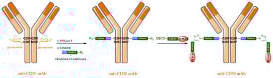 A second possibility is the use of enzyme-mediated regiospecific bioconjugation technologies. Transglutaminase and sortases can be used for this purpose [6,50,51]. For example, transglutaminase catalyzes the formation of amide bonds between the glutamine side chain of a native mAb (without modification by bioengineering) and a molecule containing a primary amine [55]. Thus, Schibli et al. (Innate Pharma) have developed a three-step methodology using transglutaminase to build an ADC [55]. The mAb is firstly deglycosylated by the PNGase F enzyme on asparagine 297. Next, an amino and nitrogen heterobifunctional linker is bioconjugated onto the mAb at glutamine 295 in the presence of microbial transglutaminase. Finally, MMAE is grafted via a copper-free Huisgen cycloaddition (SPAAC) between the azide conjugate and a linker carrying dibenzylcyclooctyne (DBCO) and MMAE, in order to generate an ADC with a DAR of 2 (Figure 3).