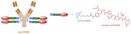 Current ADCs targeting HER2 are ineffective in removing cancer cells expressing relatively low HER2 levels of expression. As a result, only about 20% of breast cancer patients are eligible for targeted HER2 therapies. In addition, the intratumoral heterogeneity of HER2 expression is ultimately responsible for the relapse of patients who initially responded to treatment. In order to obtain potent antitumor activity in cancer cells with a wider range of HER2 expression, the biparatopic ADC IMMU4276 targeting HER2 was developed by MedImmune (Figure 6) [81]. To build this impressive molecular architecture, a bivalent biparatopic mAb was first designed to target two distinct HER2 epitopes (epitopes individually targeted by trastuzumab and pertuzumab), inducing HER2 receptor dimerization, promoting robust internalization, as well improved trafficking and lysosomal degradation. Two heavy chain cysteine residues (S239C and S442C) were introduced by antibody engineering, to produce a biparatopic ADC of DAR 4, via the regiospecific bioconjugation of a maleimidocaproyl linker carrying a new inhibitor of microtubules based on tubulysine AZ13599185. AZ13599185 is a very powerful cytotoxic agent (IC50 in the picomolar range) and has a very low affinity for MDRs (multidrug resistance proteins: transmembrane proteins ensuring the efflux of xenobiotics out of cells).