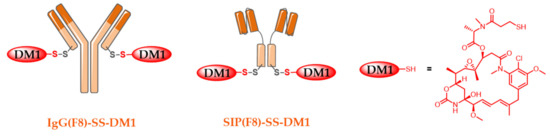 The SIP format results from the fusion of a scFv fragment with the human IgE εCH4 domain [84,85]. SIP(F8) was also produced with two unpaired cysteine residues at the C-terminal position, allowing regiospecific bioconjugation of two DM1 molecules in order to produce the SIP(F8)-SS-DM1 conjugate with a DAR 2 (Figure 7) [74]. This was compared to its IgG(F8)-SS-DM1 counterpart, carrying an unpaired cysteine residue in the C-terminal position of each light chain (Figure 7). In these immunoconjugates, the disulfide bridge, formed after bioconjugation between the protein and the drug, is sensitive to extracellular tumor-derived glutathione, releasing unmodified DM1 without any residual linkers.