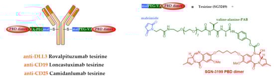 Although ADCs using talirine were stopped during clinical trials, two ADCs using the counterpart tesirine are in an advanced phase of clinical study. Rovalpituzumab tesirine (Rova-T or SC16LD6.5) is an anti-DLL3 ADC developed by AbbVie (Stemcentrx) tested in phase III in small cell lung cancer [87,88]. While ADC Therapeutics developed loncastuximab tesirine (ADCT-402) [89] and camidanlumab tesirine (ADCT-301) [90], both tested in pivotal phase II, respectively against B cell acute lymphoblastic leukemia and Hodgkin lymphoma (Figure 9). Tesirine (SG3249) was designed to combine powerful antitumor activity with desirable physicochemical properties (e.g., favorable hydrophobia and improved bioconjugation). One of the reactive imines is capped with a valine-alanine linker cleavable by cathepsin B.