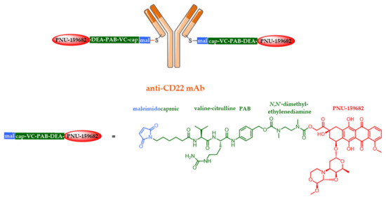 - Yu, S.F.; Zheng, B.; Go, M.; Lau, J.; Spencer, S.; Raab, H.; Soriano, R.; Jhunjhunwala, S.; Cohen, R.; Caruso, M.; et al. A novel anti-CD22 anthracycline-based antibody-drug conjugate (ADC) that overcomes resistance to auristatin-based ADCs. Clin. Cancer Res. 2015, 21, 3298–3306. [Google Scholar] [CrossRef] [PubMed]