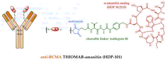 As an alternative to the previously described ADCs, Heidelberg Pharma developed a proprietary technology called ATAC (for antibody targeted amanitin conjugate) [93,94] based on the conjugation of amatoxins, which are strong RNA polymerase II inhibitors (new mechanism of action for an ADC payload). Alpha- and beta-amanitin are two well-known amatoxins, identified in the mushroom Amanita phalloides more than forty years ago. HDP-101 (Figure 11) is the most advanced ATAC. HDP-101 results from the site-specific conjugation of HDP 30.2115, a stabilized analog of α-amanitin, onto a Thiomab (designed by Genentech) targeting the B-cell maturation antigen (BCMA, CD269) through a cathepsin B-sensitive linker, to produce an ATAC with a DAR of 2. BCMA has emerged as a very selective target of choice for the treatment of multiple myeloma [95]. In vitro, HDP-101 was tested on various multiple myeloma cells taken from patients, including non-dividing cells or cells with a low concentration of BCMA antigens (down to 270 copies per cell) [96]. In all cases, the observed IC50 of the ATAC HDP-101 was in the picomolar range. Due to the hydrophilicity of the amatoxins, the observed IC50 of the ATAC HDP-101 is 20,000-fold higher (around 100 pM) than the IC50 of its free amatoxin HDP 30.2115. No toxicity was observed on non-BCMA expressing cells. Therefore, the ATAC mechanism is only based on the internalization of the ATAC-Ag complex followed by its lysosomal degradation in BCMA-positive tumor cells. In vivo, in various xenograft models of multiple myeloma, HDP-101 led to complete tumor remission in mice, and safety studies identified a very favorable therapeutic window in mice and monkeys. ATACs are a very promising class of compounds, still in a preclinical phase, although their chemistry manufacturing control (CMC) process has been successfully carried out.
