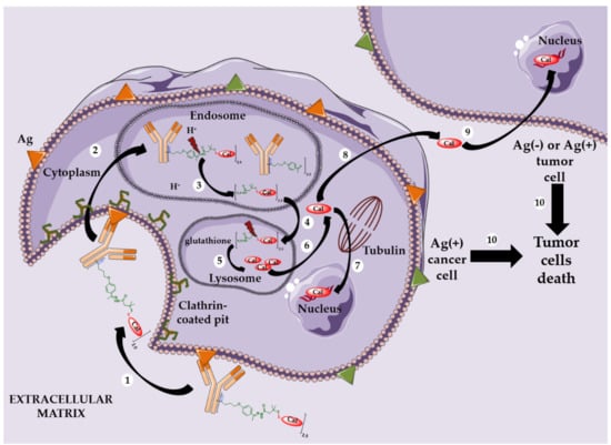 Targeting internalizing antigens on the surface of cancer cells can be extremely difficult in solid tumors rich in intercellular stroma. Thus, a new approach has been developed, consisting of tumor microenvironment (stroma or vasculature) targeting instead of cancer cells [83]. In this strategy, extracellular proteases and other components of the extracellular matrix (such as acidic medium or reducing glutathione) could be used for effective extracellular release of cytotoxics used in non-internalizing ADCs [2].