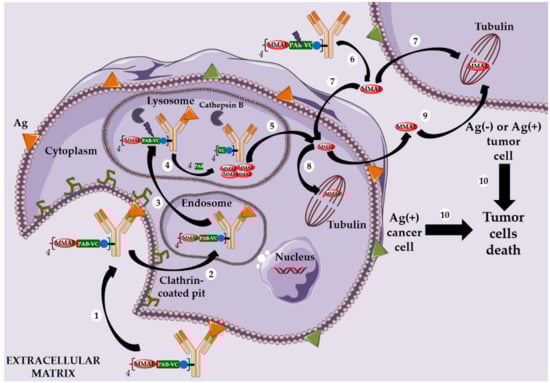 Adcetris®, Polivy® or Padcev® mechanism of action: (1) binding to a specific Ag, followed by internalization of the ADC-Ag complex according to a clathrin-dependent mechanism; (2) transfer to the endosomes then (3) to the lysosomes; (4) linker cleavage in the lysosomes takes place between the peptide sequence (ValCit) and the self-immolative spacer (PAB); (5) transfer of MMAE into the cytoplasm; (6) MMAE can also be released before internalization, then (7) enter the targeted cell (or a nearby tumor cell) and (8) intracellular or extracellular MMAE release is followed by tubulin targeting. In parallel to 8, (9) diffusion of another MMAE in neighboring tumor cells not targeted by the ADC to obtain a bystander killing effect and (10) all the previous steps lead to tumor cell death.