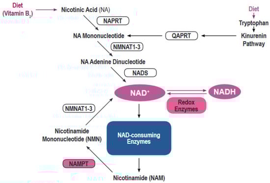 - Singhal, A.; Cheng, C.Y. Host NAD+ metabolism and infections: Therapeutic implications. Int. Immunol. 2019, 31, 59–67. [Google Scholar] [CrossRef]