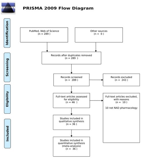 In the initial screen, 289 records were identified. All were reviewed to ensure relevance and full-text availability. Of these, 36 records met the eligibility requirements. The characteristics of these studies are summarized in Table 1, in that the authors reported human trial data for interventions based on NAD pharmacology.