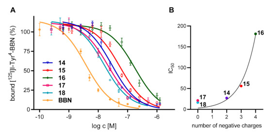 Results of the competitive displacement assays of the hybrid multimodal imaging synthon-bioconjugates 14–16, the reference compounds 17 and 18 as well as bombesin (BBN) on stably GRPR-transfected human embryonic kidney 293 (HEK) cells using [125I]I-Tyr4-bombesin as competitor. The 50% inhibitory concentration (IC50) values for BBN (being used as internal standard with known high GRPR affinity) and 14–18 were determined to be 2.81 ± 0.56 nM, 27.39 ± 2.01 nM, 56.07 ± 1.47 nM, 181.23 ± 2.45 nM, 21.48 ± 1.2 nM and 16.64 ± 1.06 nM, respectively (A). Correlation between IC50 values and number of negative charges of 14–18 (B).