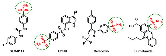 Several promising anticancer agents have been reported incorporating the ionizable sulfonamide (-SO2NH-) group [34]. Such rigid functionalities serve as efficient zinc-binding groups for ligand anchoring where they can coordinate, through their negatively deprotonated forms, to the catalytic Zn(II) cation for replacing the zinc-bound water molecule and achieving a tetrahedral-coordinated geometry [35,36]. Furthermore, the hydrogen atom on the coordinated nitrogen atom satisfies the hydrogen-bond accepting character of the conserved histidine residue within the CAs active sites [37]. Both the phase-I/II clinical candidates, SLC-0111 and E7070 (Figure 1), harbor such an ionizable group and have been investigated for the management of advanced metastatic or relapsed cancers (refer ClinicalTrials.gov; NCT02215850 and NCT01692197, respectively). At the same time, several therapeutics in clinical use, such as celecoxib and bumetanide (Figure 1), possess significant inhibition activity towards the tumor-associated hCAs related to their sulfonamide-pharmacophoric feature, in addition to their main pharmacotherapeutic activity [38,39,40]. Bumetanide showed low nanomolar inhibition activity on the tumor-associated hCA isoforms (Ki = 21.1–25.8 nM) and is a promising effective anticancer agent because it also showed moderate (250–700 nM) or weak (2.57–6.98 μM) inhibition for mitochondrial or cytosolic hCAs, respectively [39,41]. Such a preferential pattern may be related to the sterically hindering phenoxy moiety being ortho to the sulphamoyl-Zn(II)-binding group. This bulky group hinders the bumetanide anchoring within hCA-I- or -II-occluded active sites where respective bulky residues (His67/Phe91/Tyr204 or Phe131) are present at these site entrances [39].
