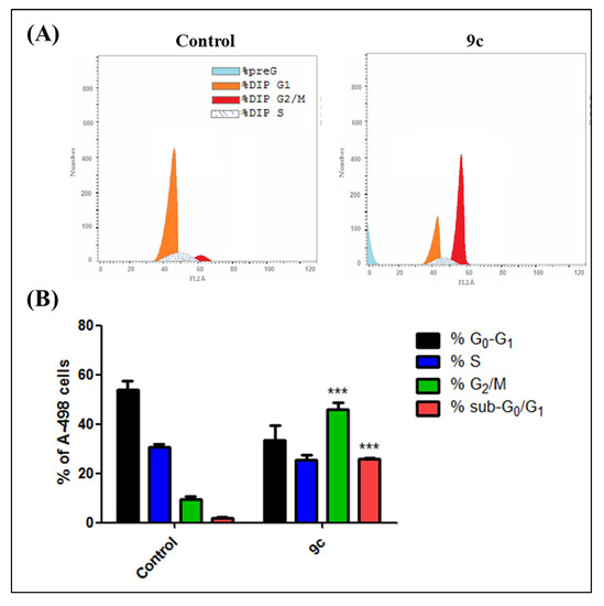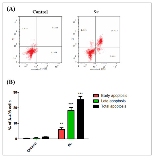 A-498 Cells were seeded at a density of 1 × 105 cells/well in 24-well plates and treated with compound 9c (6 µM) for 48 h. The cells were collected by trypsinization and centrifuged at 800× g for 15 min. Cells were washed twice with ice-cold PBS and fixed in ice-cold 70% ethanol overnight at −20 °C. Fixed cells were centrifuged at 800× g for 15 min and stained with 50 μg/mL of PI, containing 50 μg/mL of DNase-free RNase A, at 37 °C for 30 min. The DNA content of cells (10,000 cells/experimental group) was analyzed by flow cytometer at 488 nm using a FACSCalibur flow cytometer (BD Biosciences, San Jose, CA, USA) and all data were recorded and analyzed using the CellQuest Software (Becton-Dickinson Biosciences, San Jose, CA, USA). For Annexin V/PI Apoptotic Assay, apoptotic cell death was detected by flow cytometry using Annexin-V/FITC Apoptosis Detection Kit (Cat. №. K101-25; BiovisionTM, USA). Based on the kit manufacturer’s protocol, A-498 Cells were seeded in 24-well plated at density of 1 × 105cells/mL and incubated for 24 h and subsequently treated with either vehicle (0.1% (v/v) EtOH), compound 9c at 6 µM for 48 h. Cells were then harvested and prepared for flow cytometric analysis. Cells were washed in 1× binding buffer (20× binding buffer: 0.1 M HEPES, pH 7.4; 1.4 M NaCl; 25 mM CaCl2diluted in dH2O) and incubated in the dark for 30 min on ice in Annexin V-containing binding buffer [1:100]. Cells were then washed once in binding buffer and then re-suspended in PI-containing binding buffer [1:1000]. Samples were analyzed immediately using the BDaccuri flow cytometer (excitation = 488 nm; emission = 530 nm) and FCSExpress® V.5 (De Novo SoftwareTM, Pasadena, CA, USA). For analysis of the data, four populations are produced during the assay Annexin V and PI negative (Q4, healthy cells), Annexin V positive and PI negative (Q3, early apoptosis), Annexin V and PI positive (Q2, late apoptosis), and Annexin V negative and PI positive (Q1, necrosis).
