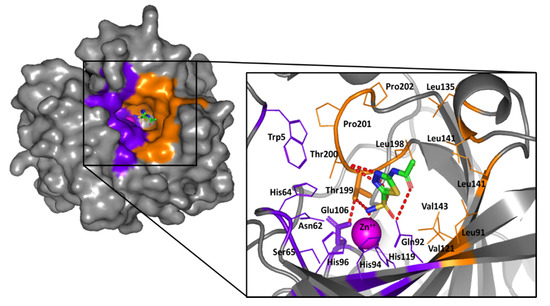 Notably, the ligand’s primary sulfonamide-based zinc-binding group (ZBG) interacts with one of the conserved residues, Thr199 and Glu106, which serve as the enzyme “gate keepers.” Serving fundamental roles within the catalysis process, Thr199 coordinates to the Zn(II)-bound water/hydroxide in the uninhibited enzyme, while Glu106 offers hydrogen bonding stabilization to Thr199 through its carboxylate moiety [18]. The periphery of the crystallized ligand is oriented at the center of the large open conical cavity spanning towards the surface of the protein. The canonical cavity shows two distinct halves made of hydrophobic or hydrophilic amino acids. Particularly, Asn62, His64, Ser65, Gln67, and Gln92 define the hydrophilic half of the active site, while Thr69, Leu91, Val121, Val131, Leu135, Leu141, Val143, Leu198, and Pro202 identify the lipophilic portion. The hydrophobic site division has the biological role of supporting the pathway for the entry and exit of both the natural substrate and product, while the hydrophilic face defines an ordered solvent network for proton transfer [43]. Notably, the establishment of favored contacts with the distal hydrophobic residues lining the active site entrance has been correlated to hCA-IX isozyme selectivity and defining the favored binding affinities of several hCA-IX inhibitors [37,50,51,52]. This selective pocket is located within the 5–15 Å radial zone, relative to the central position of the Zn(II)-ion, comprising the residues Thr69, Leu91, Val121, Val131, and Val143 [23,24,53].
