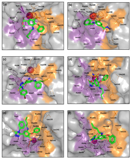 The predicted binding modes of the investigated compounds (sticks) at the hCA-IX binding site (PDB ID: 3iai); (a) 2; (b) 3; (c) 9c; (d) 5; (e) 9a; (f) 4. The active site cleft within the suggested ligand-protein complexes is illustrated as gray surface representation depicting the prosthetic Zn(II) (magenta sphere), as well as the hydrophilic (purple) and hydrophobic (orange) residues as lines. Hydrogen bonding is depicted as red dashed-lines, while polar coordination to Zn(II) as black dashed-lines. Only residues located within 5 Å radius of bound ligands are displayed (lines) and labeled with sequence number.