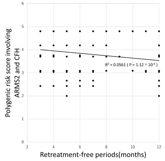 Mean and median retreatment-free period was 7.4 ± 3.5 and 6 months, respectively. Eighty-six (33%) patients did not require additional injections. There was a significant negative correlation between the retreatment-free period and the polygenic risk score involving ARMS2 and CFH (R = −0.237, P = 1.12 × 10−4, Pearson correlation test).