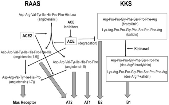 Kinins produce a plethora of physiological actions including vasodilatation and increased vascular permeability via activation of the B1 and B2 receptors [12,13]. The former is upregulated during inflammation episodes or tissue trauma, whereas the latter is constitutively expressed in a variety of cell types. BK and Lys-BK are agonists of the B2 receptor, whereas the des-Arg analogs are agonists of the B1 receptor [14]. ACE and the ACE2 enzymes are actors involved in the cross-talk between RAAS and KKS. The former upregulates angiotensin II and downregulates BK, whereas the latter upregulates angiotensin (1–9) and downregulates des-Arg kinins, respectively [15].