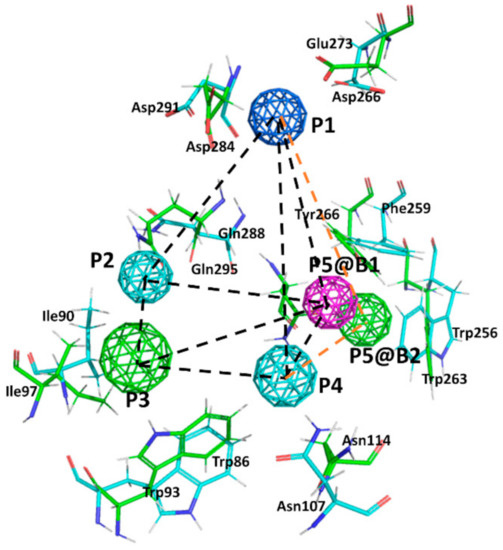 Superposition of the B1 and B2 receptor pharmacophores. Colored spheres represent pharmacophore points (P1–P5) according to the following color code: dark blue represents a positive charge moiety; magenta a hydrogen bond accepting center; light blue a hydrogen bond donor/acceptor center; green an aromatic/lipophilic center. @B1 and @B2 is used to differentiate P5 for the B1 and B2 receptors, respectively. Consensus distances between common pharmacophore points are (black dotted lines): d(1,2) = 9 Å; d(1,3) = 14 Å; d(1,4) = 10.5 Å; d(2,3) = 6 Å; d(2,4) = 7 Å; d(3,4) = 7.5 Å. Specific distances for the B1 pharmacophore: d(1,5) = 9.5 Å; d(2,5) = 9.3 Å; d(3,5) = 9.5 Å; d(4,5) = 5.7 Å; whereas for the B2 pharmacophore are (orange dotted lines): d(1,5) = 11 Å; d(2,5) = 9 Å; d(3,5) = 8.8 Å; d(4,5) = 8.4 Å. Side chains of the main residues involved in defining the binding pocket for non-peptide ligands are explicitly depicted: green for the B1 and blue for the B2, respectively.