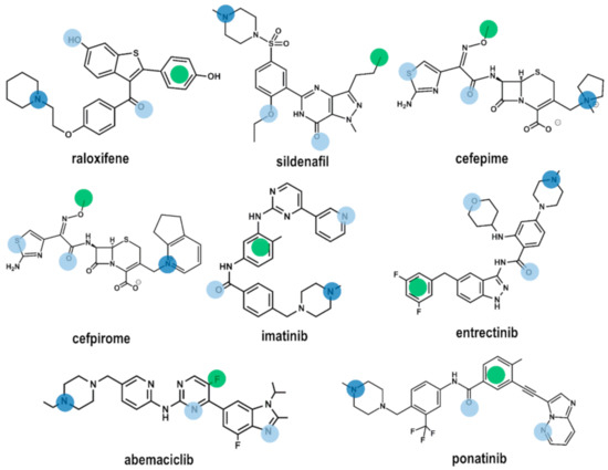 Using the four common pharmacophore points P1–P4 as a query, we carried a in silico screening on the DrugBank using the Molecular Operating Environment (MOE) program [35]. The DrugBank is a database containing comprehensive information of all FDA approved drugs [36]. In order to carry out the virtual screening study, we first generated the corresponding 3D DrugBank database using the Database Viewer module of MOE [35]. The database contains for each molecule its 3D structure together with a set of conformations, generated using a build-up procedure from systematic conformational searches of molecular fragments. Virtual screening was carried out on a subset of 1703 molecules selected according to their molecular weight between 200 and 600. Hits obtained were subsequently docked onto the 3D models of the B1 and B2 receptors, respectively to check for possible steric hindrance. Preliminary results of the virtual screening yielded eight drugs (Figure 4): raloxifene [37], a selective estrogen receptor modulator; sildenafil [38], a phosphodiesterase type 5 inhibitor; cefepime [39] and cefpirome [40], two β-lactam antibiotics; imatinib [41] and ponatinib [42], two bcr-Abl tyrosine kinase inhibitors; abemaciclib [43], a dual inhibitor of cyclin-dependent kinases 4 and 6; and entrectinib [44] a non-selective tyrosine kinase inhibitor. According to the results of this study, these compounds exhibit the characteristics to be non-selective BK ligands. Figure 4 shows the location of the common pharmacophore points on their 2D chemical structures. Evaluation of the ability of these compounds to act as B1 and B2 receptor antagonists is currently underway.