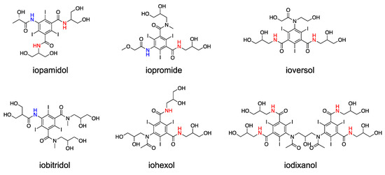 Chemical structures of X-ray/CT contrast agents that have been investigated for CEST MRI studies. Because of the different chemical environments, the amide protons may have different chemical shifts, which are indicated in different colors.