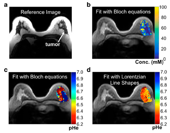 Parametric maps of the patient with high-grade invasive ductal carcinoma. (a) A representative image of the patient with high-grade invasive ductal carcinoma. (b) A parametric map of tumor concentration determined with Bloch fitting is overlaid on the anatomical image. (c) A parametric map of tumor pHe determined with Bloch fitting is overlaid on the anatomical image. (d) A parametric map of tumor pHe determined with Lorentzian fitting is overlaid on the anatomical image. (Reprinted with permission from Ref [108]).