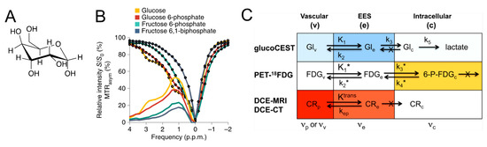 GlucoCEST MRI. (A) Chemical structure of glucose. (B) Z-spectra and MTRasym spectra of glucose and its first-step metabolite glucose 6-phosphate, as compared to that of fructose 6-phosphate and fructose 6,1-biphosphate (Reprinted with permission from Ref [60]). (C) Overview of rate constants and contrast contributions (darker color = higher contrast; white is negligible contrast) for glucoCEST, 18FDG-PET, and contrast-enhanced MRI and CT in tumors. For glucoCEST, the glucose concentrations in vascular space and EES are comparable, but due to lower pH the EES has a higher signal contribution. Intracellular signal is very small to negligible due to rapid glycolysis. In PET, the signal is predominantly due to trapped intracellular phosphorylated FDG. For contrast-enhanced MR and CT, the agents occupy only plasma in blood and while they enter the interstitium, the EES concentration is generally lower than in plasma due to limited Ktrans. Glucose, on the other hand moves freely into the interstitium and the erythrocytes. v = vascular (plasma + erythrocytes), p = plasma. Reprinted with permission from Ref [61].
