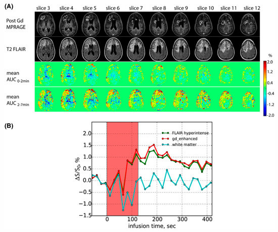 Glucose-enhanced CEST MRI (GlucoCEST) study using a 3 Tesla human scanner. (A) Post-Gd T1 MPRAGE, T2 FLAIR, mean DGE AUC (0–2min), mean DGE AUC (2–7 min) images; and (B) DGE signal as a function of infusion time in the Gd-enhanced, FLAIR hyperintense, and posterior normal appearing WM. The AUC maps clearly show the higher uptake of glucose in the regions with hyperintense in the T2FLAIR images than brain parenchyma. The patient was previously diagnosed with an IDH mutant glioblastoma at the time point of 3 months post-surgery. Reprinted with permission from Ref [117].