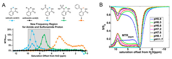 CEST MRI contrast of salicylic acid (A). CEST contrast curves for representative salicylic acid (1) and anthranilic acid derivatives (2, 4, 11 and 12) at concentrations of 25 mM (pH 7.1–7.4) using B1 = 3.6 μT, Tsat = 3 s. The gray box indicates this group of agents includes a new frequency region for amide and sulfonamide protons. Reprinted with permission from [136]. (B) pH effect on the contrast of salicylic acid at pH = 5.8–11.7. Concentration = 25 mM, and B1 = 7.2 μT. Maximal contrast was observed between pH 6.5 and 7.0. Reprinted with permission from Ref [91].